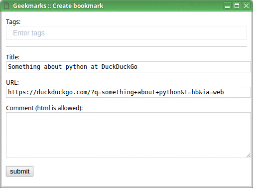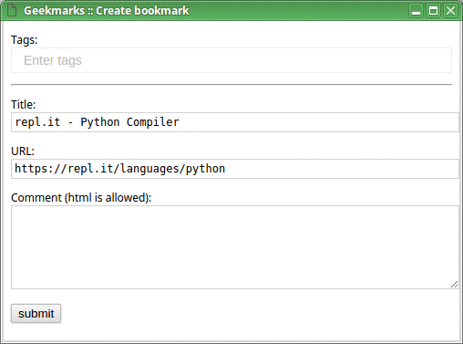 And last but not least, I love open-source. So, meet Geekmarks! A free, open-source, API-driven bookmarking service.